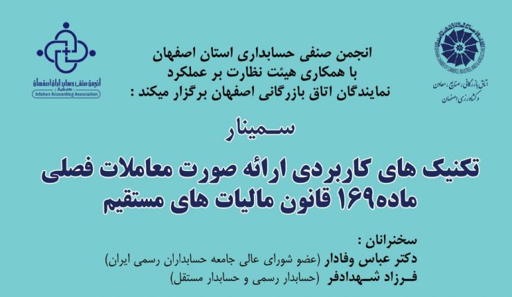در تاریخ 12 دی ماه 1396 در سالن همایش های بین المللی اتاق بازرگانی اصفهان، انجمن صنفی حسابداری استان اصفهان با همکاری هیئت نظارت بر عملکرد نمایندگان اتاق بازرگانی اصفهان اقدام به برگزاری سمیناری با موضوع، تکنیک های کاربردی ارائه صورت معاملات فصلی ماده 169و 169 مکرر قانون مالیات های مستقیم با سخنرانی دکتر عباس […]